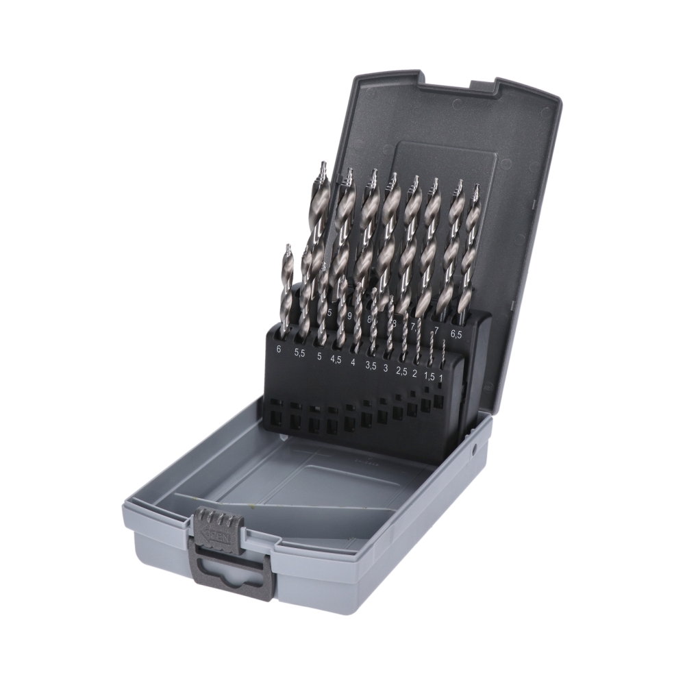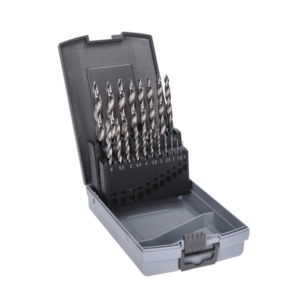 19 dílná sada PROFI RS HSS obsahuje vrtáky od 1 do 10 mm s odstupňováním 0,5 mm: ø 1; 1,5; 2; 2,5; 3; 3,5; 4; 4,5; 5; 5,5; 6; 6,5; 7; 7,5; 8; 8,5; 9; 9,5 a 10 mm.
