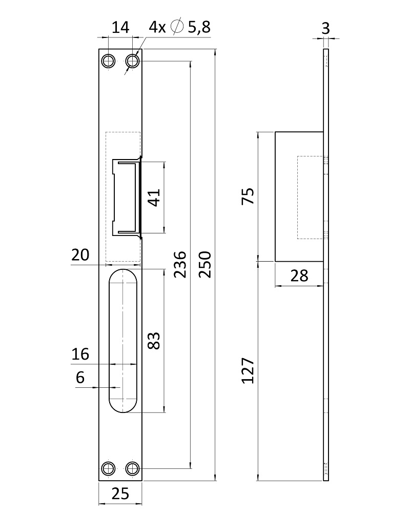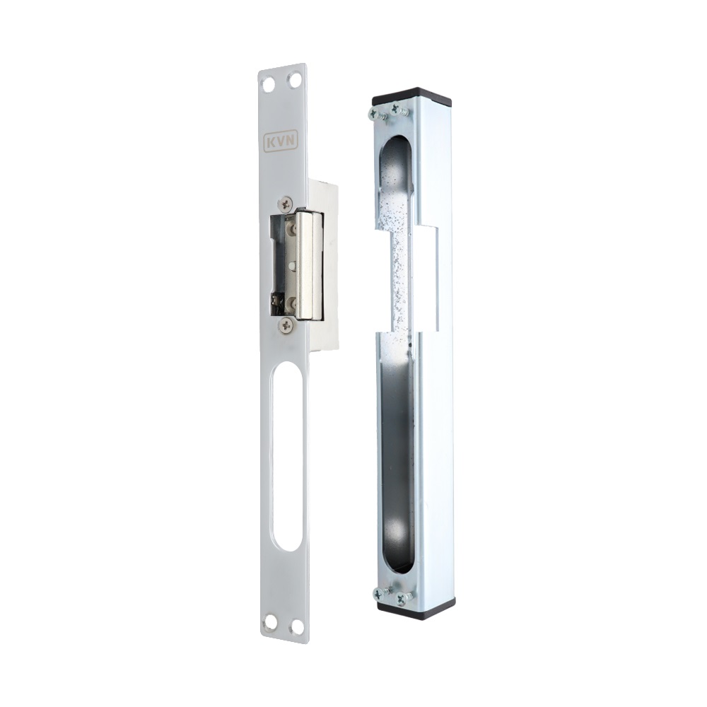 EZKD500 - set - dorazová kazeta EZK309 pozinkovaná (260 x 30 x 30 mm) + elektrický zámek EZD332 (s lištou, pamětí a odblokováním, napětí 8 - 14 V, proud AC/DC). Univerzální pro pravé i levé dveře.