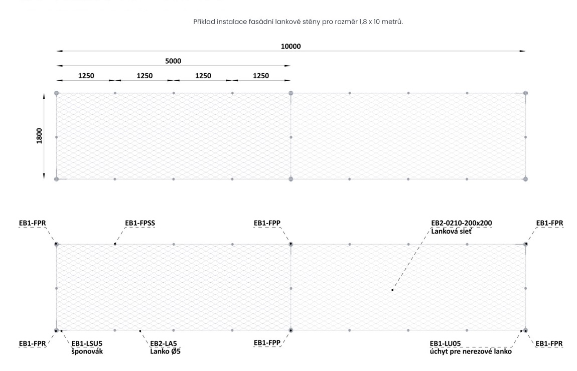 Lanková stěna pro zeleň - tzv. zelená stěna, rozměr 1,8 x 10 m, kompletní set. Materiál nerezová lanková síť s oky 20 x 20 cm, lanka ø 2 a 5 mm, příruby, úchyty lanka, šponováky, lisovací pouzdra. Materiál kombinace nerezi AISI 304 a 316.