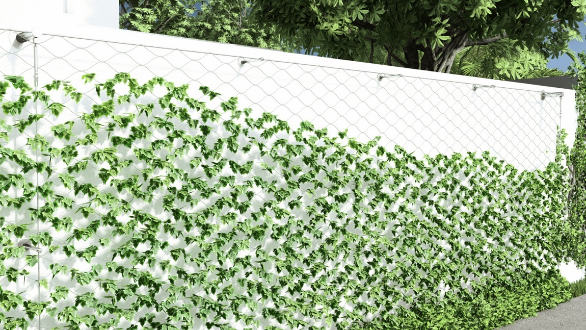 Lanková stěna pro zeleň - tzv. zelená stěna, rozměr 1,8 x 10 m, kompletní set. Materiál nerezová lanková síť s oky 20 x 20 cm, lanka ø 2 a 5 mm, příruby, úchyty lanka, šponováky, lisovací pouzdra. Materiál kombinace nerezi AISI 304 a 316.