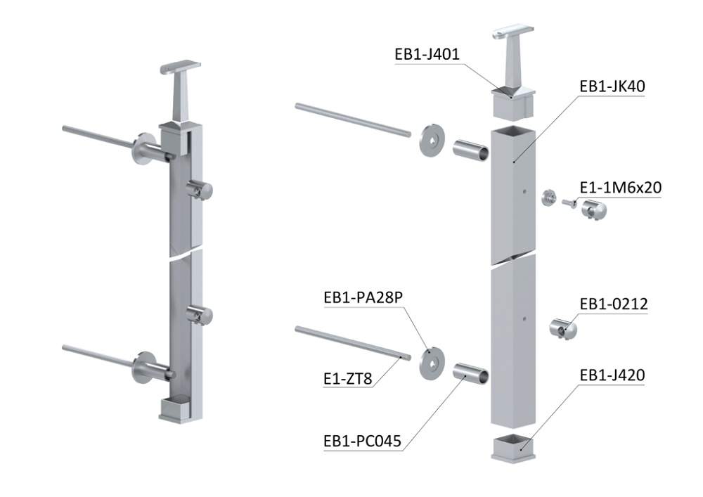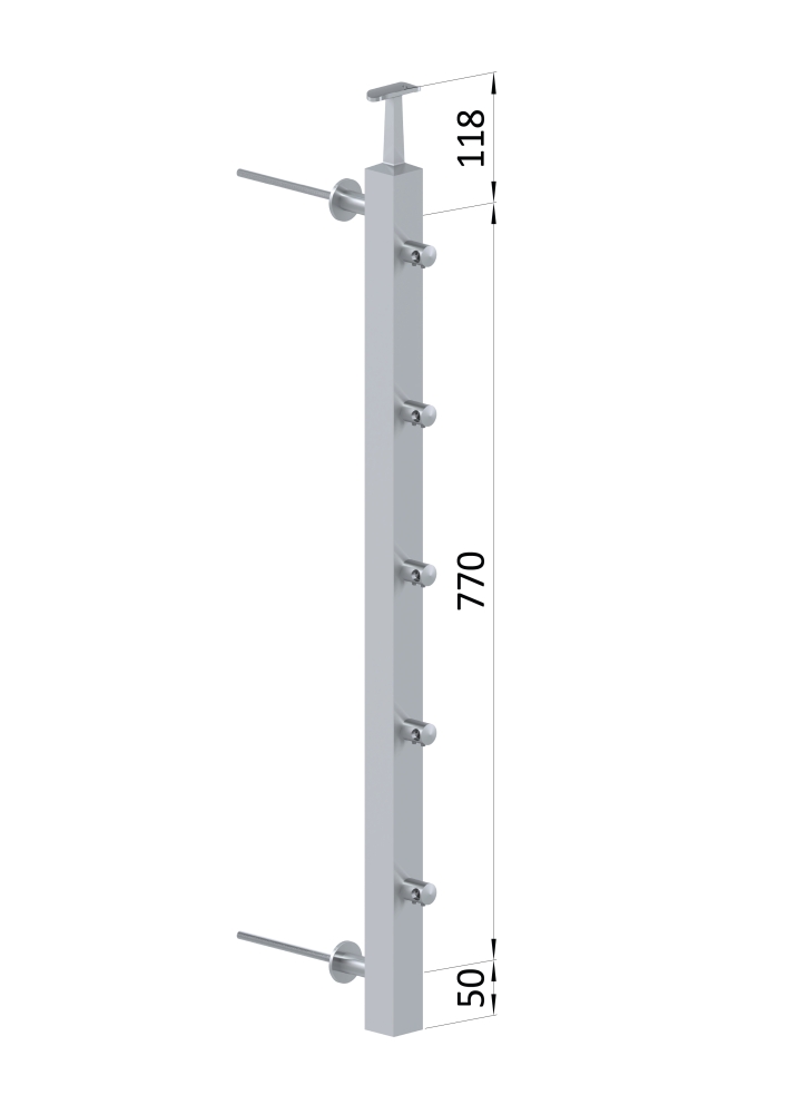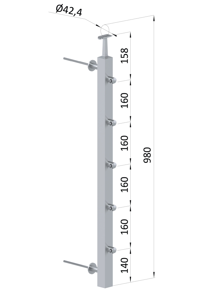 Nerezový hranatý sloupek na francouzský balkon, rozměr profilu 40 x 40 mm, tl. stěny 2 mm. Materiál broušená nerez K320/AISI304. Sloupek je kompletní se všemi potřebnými komponenty - součástí sloupku je pevný držák kulatého madla, 5 držáků prutové výplně a 2 kotevní trny. Sloupek se kotví na zeď - z čela na fasádu. Po namontování madla je celková výška sloupku 980 mm.