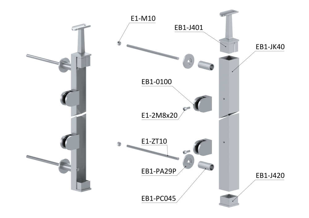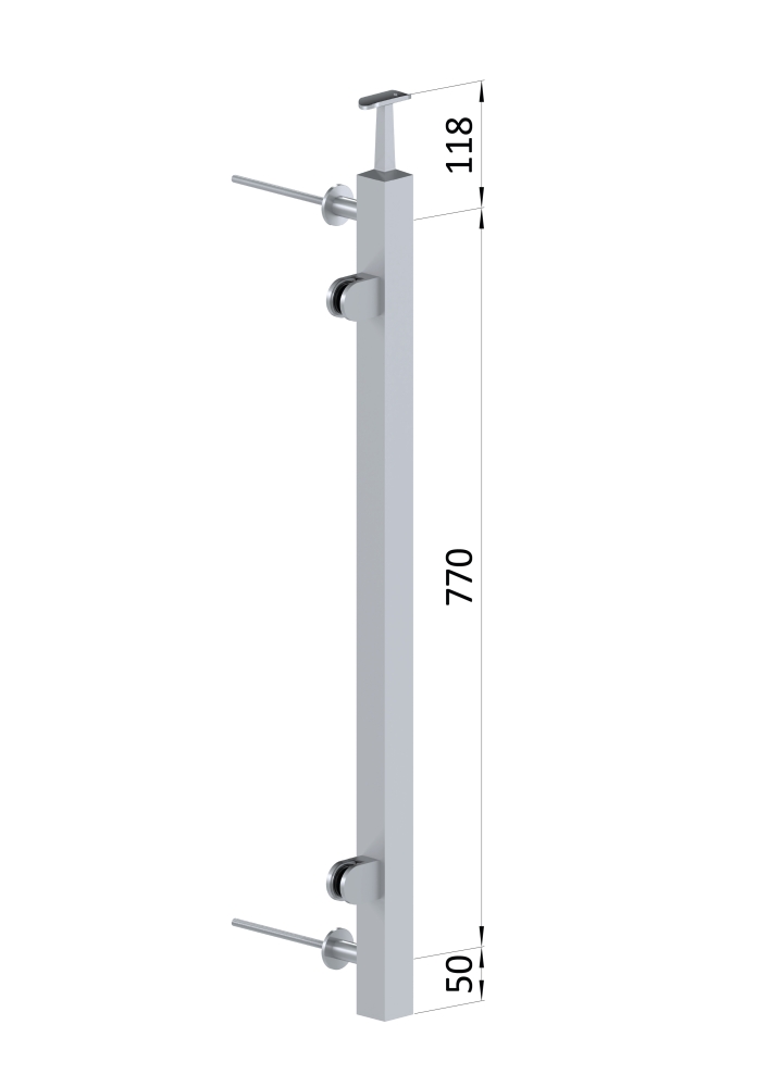 Nerezový sloupek na francouzský balkon, hranatý, rozměr profilu 40 x 40 mm, tl. stěny 2 mm. Materiál broušená nerez K320 /AISI304. Sloupek je kompletní se všemi potřebnými komponenty - součástí sloupku je pevný držák kulatého madla, 2 držáky skla a 2 kotevní trny. Sloupek se kotví na zeď - z čela na fasádu. Po namontování madla je celková výška sloupku 980 mm.
