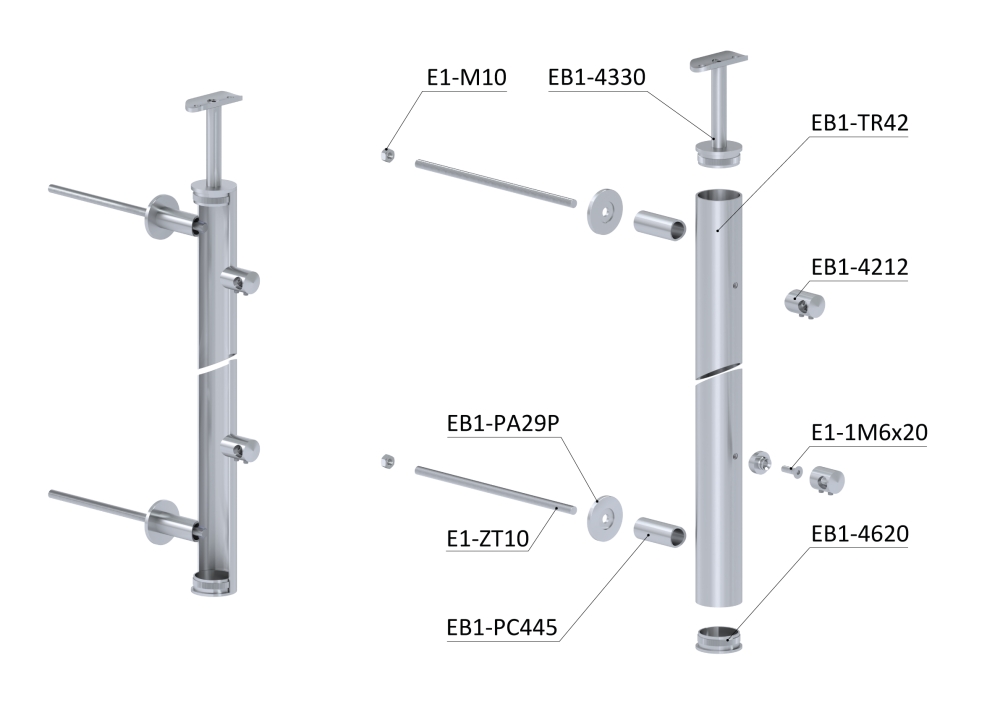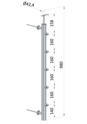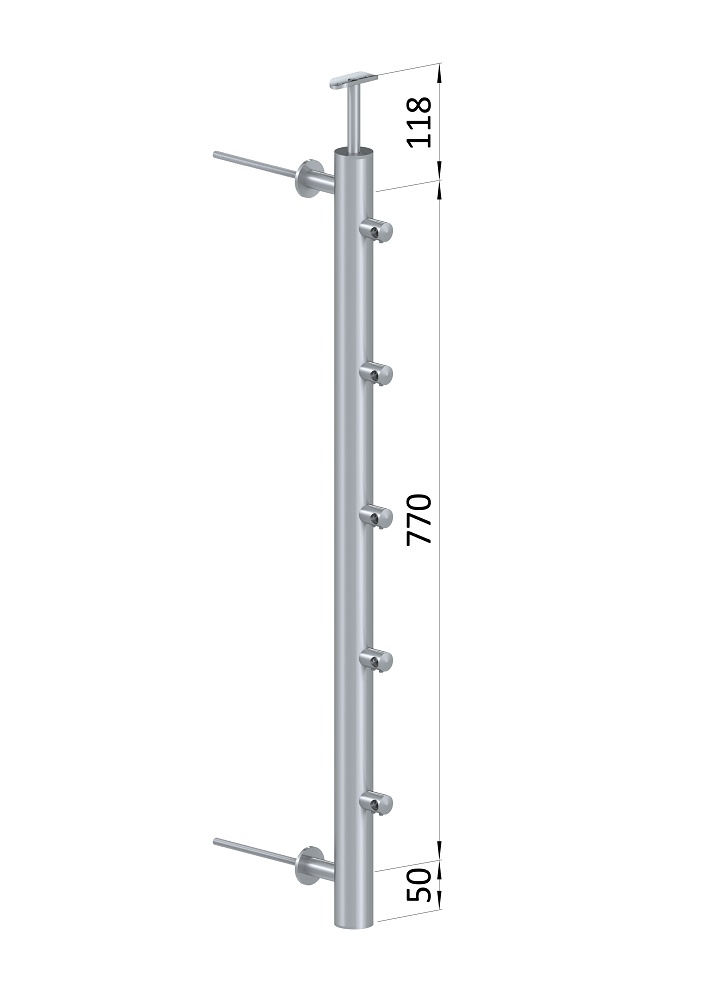 Nerezový kulatý sloupek na francouzský balkon, průměr sloupku 42,4 mm, tl. stěny 2 mm. Materiál broušená nerez K320/AISI304. Sloupek je kompletní se všemi potřebnými komponenty - součástí sloupku je pevný držák kulatého madla, 5 držáků prutové výplně a 2 kotevní trny. Sloupek se kotví na zeď - z čela na fasádu. Po namontování madla je celková výška sloupku 980 mm.