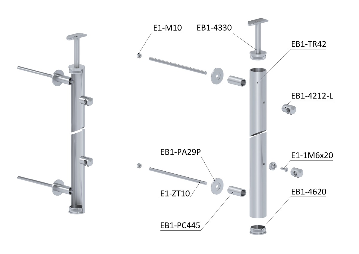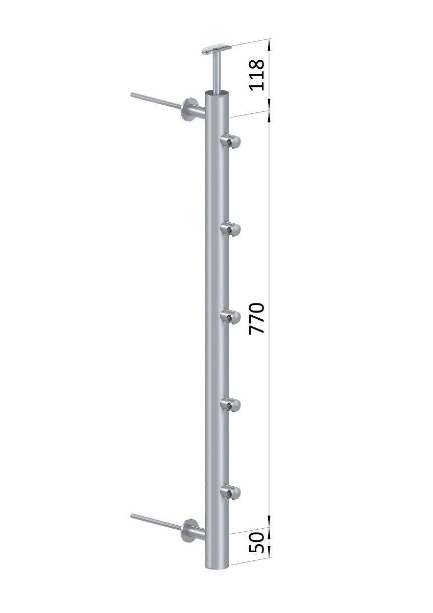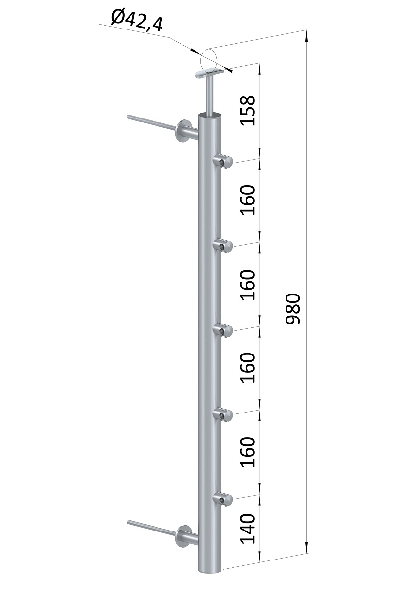 Nerezový sloupek na francouzský balkon, kulatý, průměr sloupku 42,4 mm, tl. stěny 2 mm. Materiál broušená nerez K320 /AISI304. Sloupek je kompletní se všemi potřebnými komponenty - součástí sloupku je pevný držák kulatého madla, 5 držáků prutové výplně a 2 kotevní trny. Sloupek se kotví na zeď - z čela na fasádu. Po namontování madla je celková výška sloupku 980 mm.