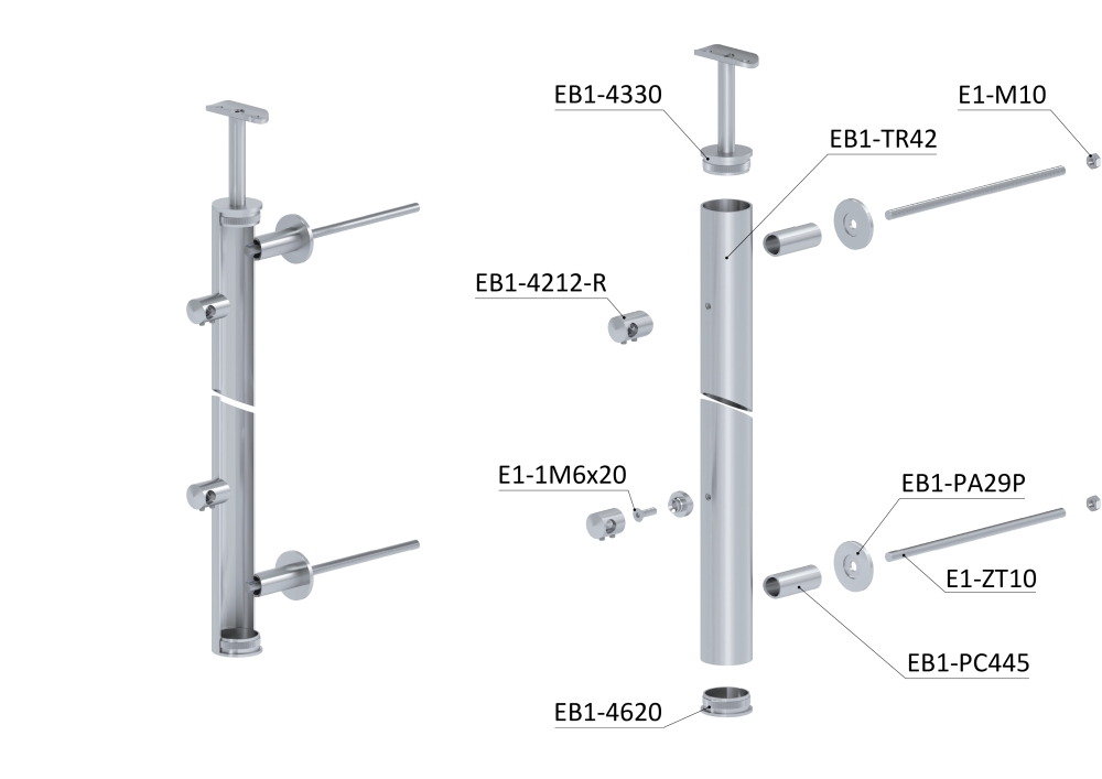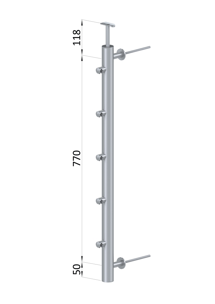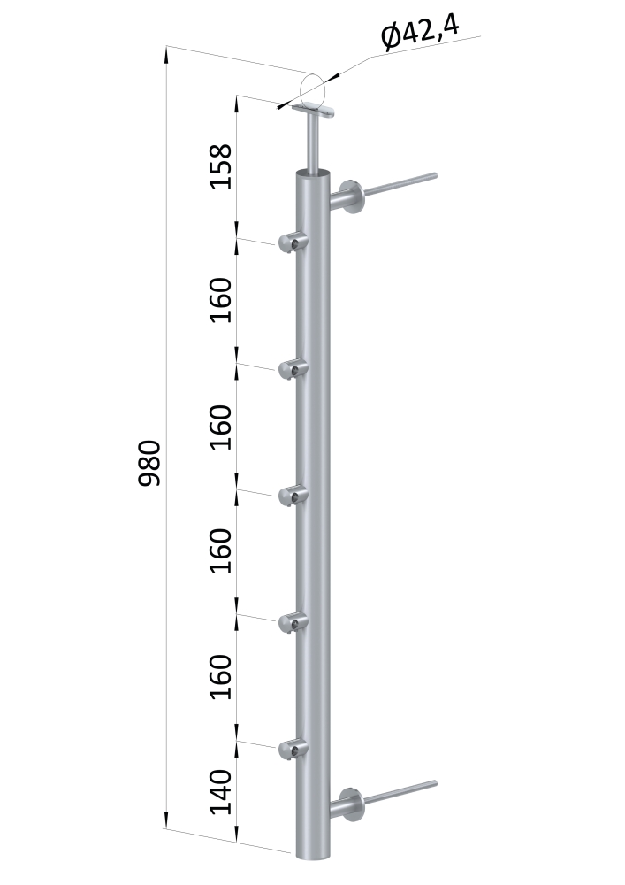 Nerezový sloupek na francouzský balkon, kulatý, průměr sloupku 42,4 mm, tl. stěny 2 mm. Materiál broušená nerez K320 /AISI304. Sloupek je kompletní se všemi potřebnými komponenty - součástí sloupku je pevný držák kulatého madla, 5 držáků prutové výplně a 2 kotevní trny. Sloupek se kotví na zeď - z čela na fasádu. Po namontování madla je celková výška sloupku 980 mm.