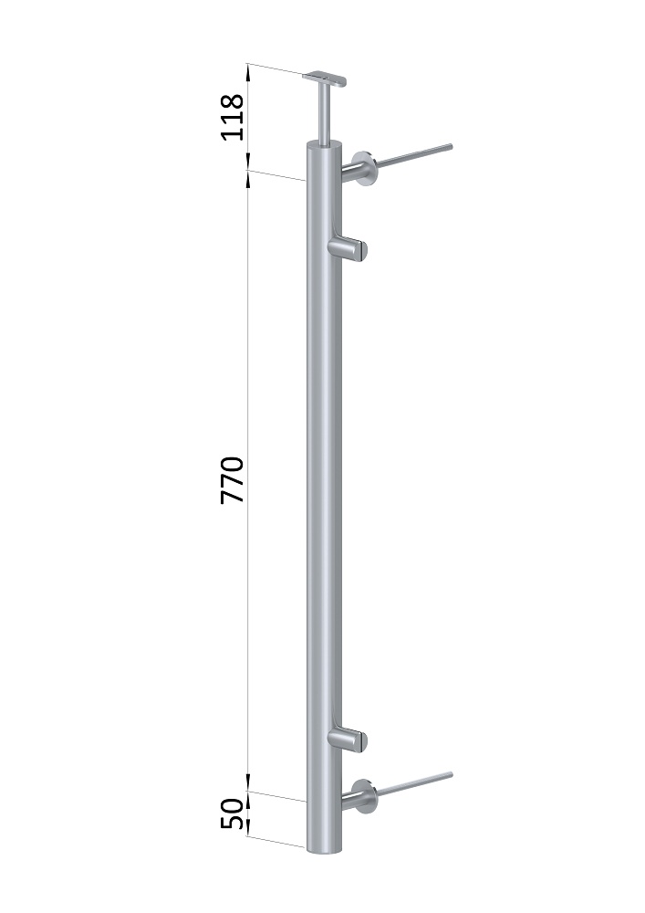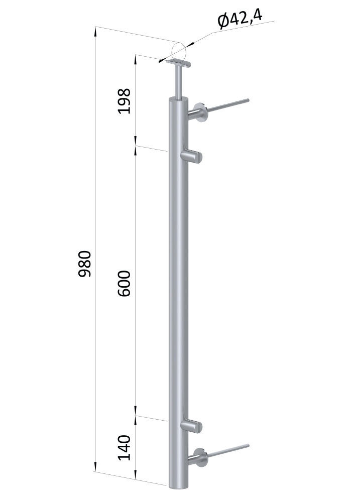 Nerezový sloupek na francouzský balkon, kulatý, průměr sloupku 42,4 mm, tl. stěny 2 mm. Materiál broušená nerez K320 /AISI304. Sloupek je kompletní se všemi potřebnými komponenty - součástí sloupku je pevný držák kulatého madla, 2 držáky plechu 2 kotevní trny. Sloupek se kotví na zeď - z čela na fasádu. Po namontování madla je celková výška sloupku 980 mm.
