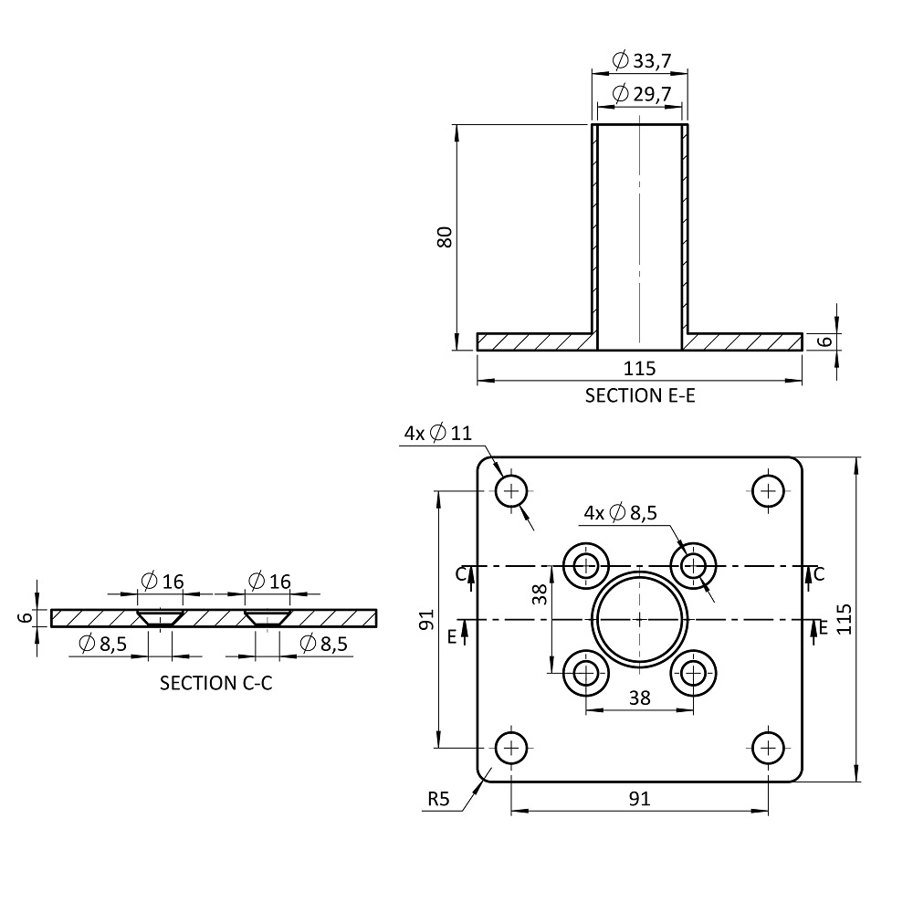 Spodní hliníková konzola pro montáž profilu AL-SP70, materiál hliník EN AW-6060 T66 bez povrchové úpravy, rozměr 115 x 115 mm, výška 80 mm.