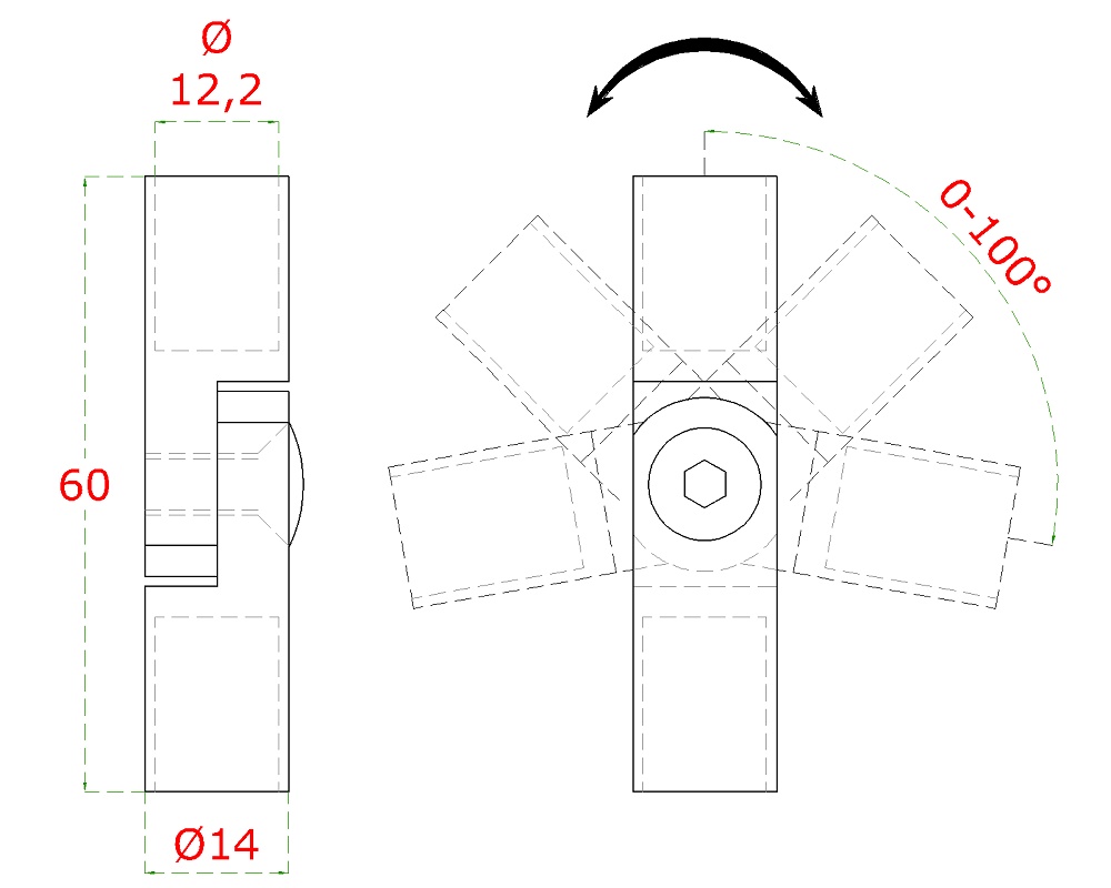 EB1-1305 - spoj s kloubem na trubku ø 12 mm, nastavení sklonu 0°- 100°, materiál broušená nerez K320...Ukaž celý popis >