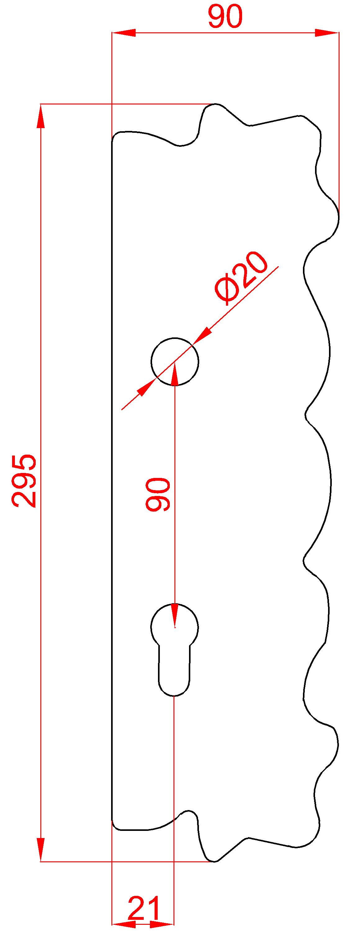 KZ025 - štítek kovaný s otvory 295 x 90 x 4 mm, rozteč 90 mm, pravý, otvor pro kliku ø 20 mm. Vhodný zámek je např. ZM90/40H.
