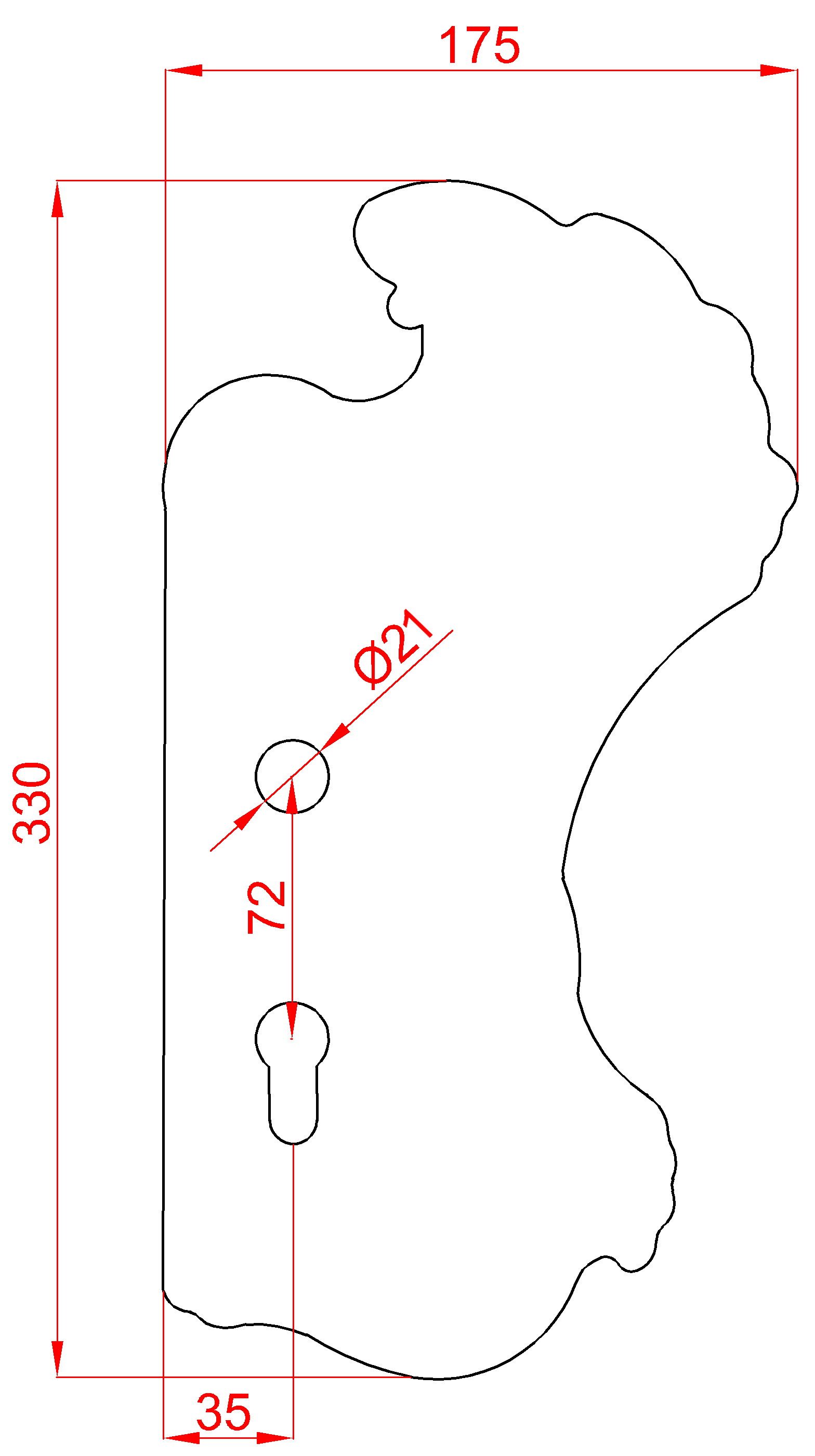 KZ056 - štítek kovaný ozdobný 330 x 175 x 3 mm, rozteč 72 mm, otvor pro kliku ø 21 mm, pravý. Vhodný zámek je např. ZM90/50H.
