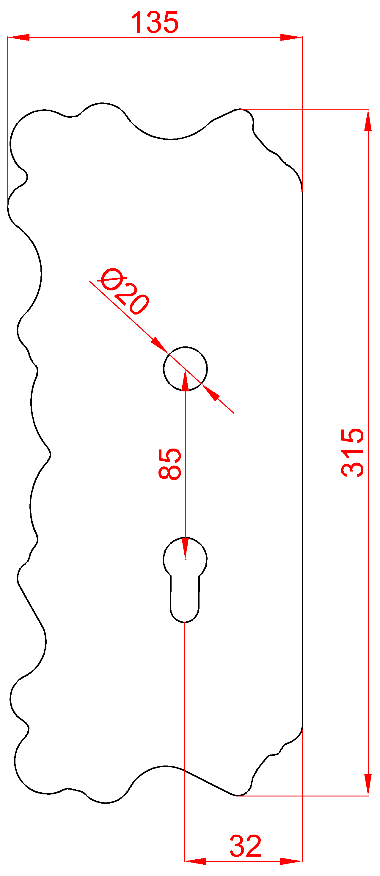 KZ061/85 - štítek kovaný s otvory, rozměr 315 x 135 x 3 mm, otvor pro kliku ø 20 mm, rozteč 85 mm, levý.