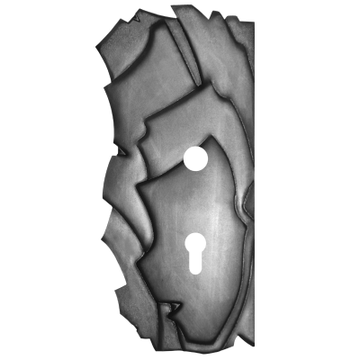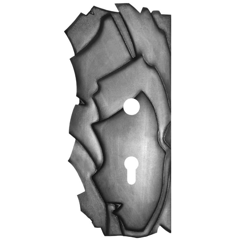 KZ068L - štítek kovaný ozdobný 295 x 136 x 2 mm, levý, rozteč 90 mm, otvor pro kliku ø 20 mm, otvor pro zámek FAB, bez povrchové úpravy.