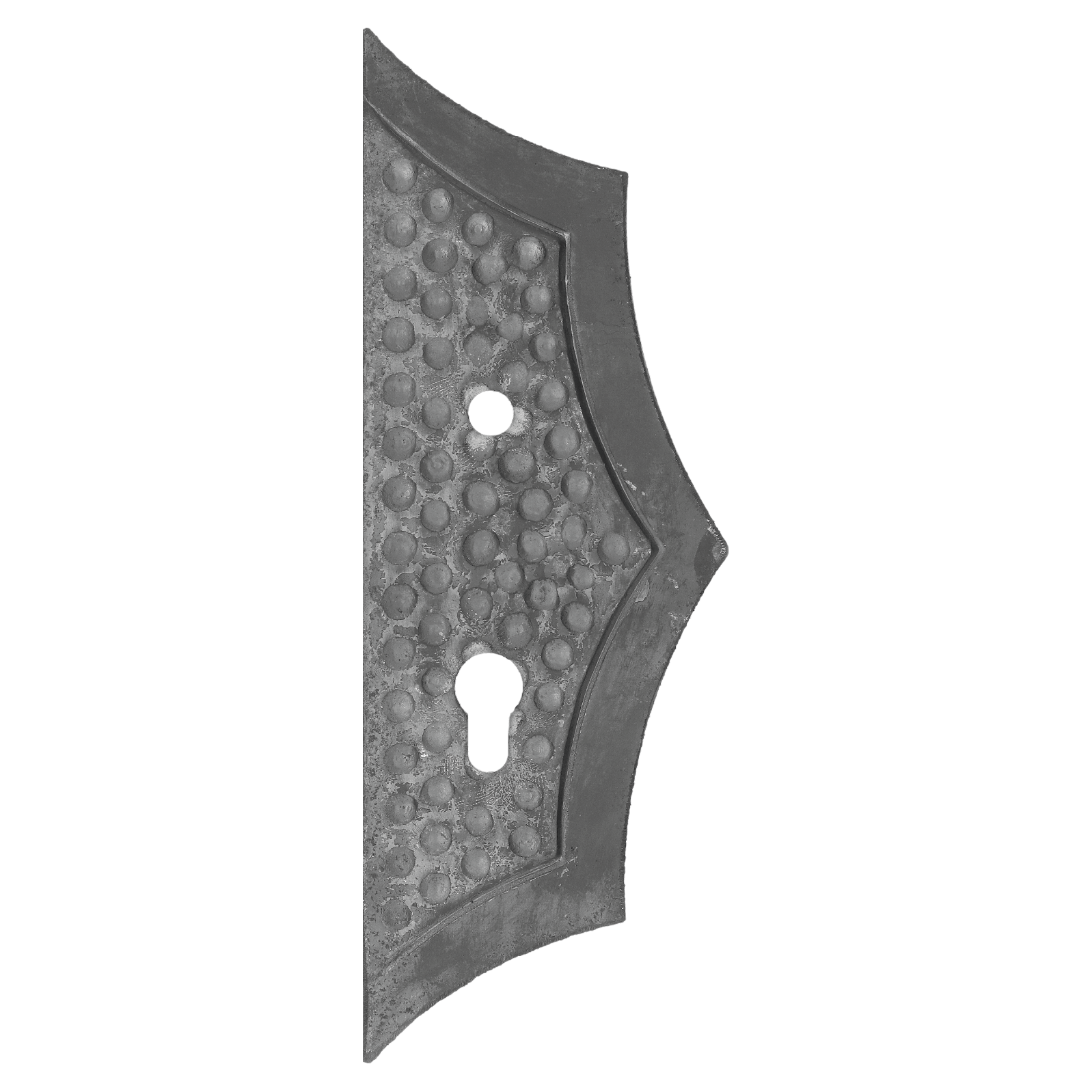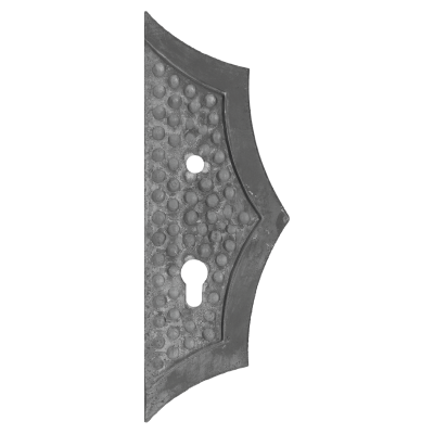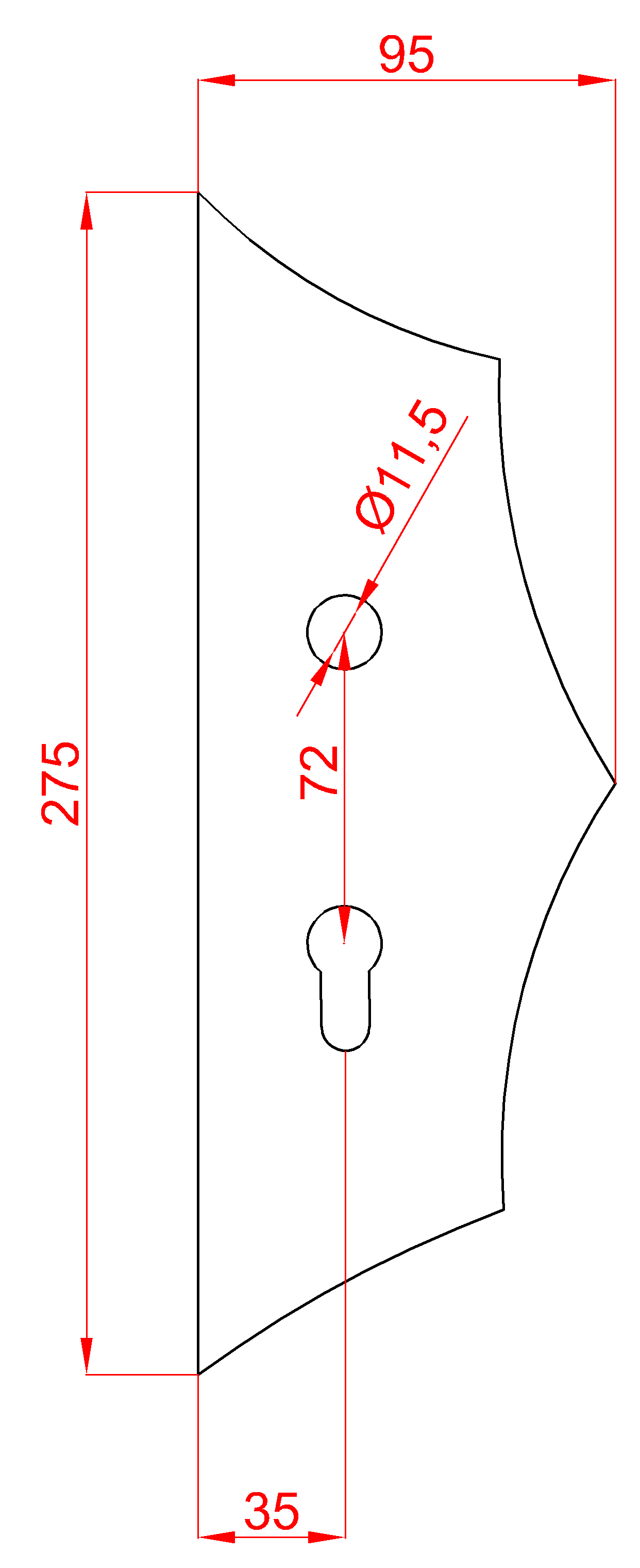 KZ28P - štítek kovaný ozdobný, rozměr 275 x 95 x 5 mm, rozteč 72 mm, otvor ø 12 mm, pravý. Vhodný zámek je např. ZM72/50.