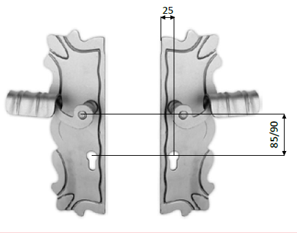 KZL13L/85 - štítek ozdobný s klikou 295 x 90 x 3 mm, rozteč 85 mm, levý. Vhodný zámek je např. ZM85/40H.