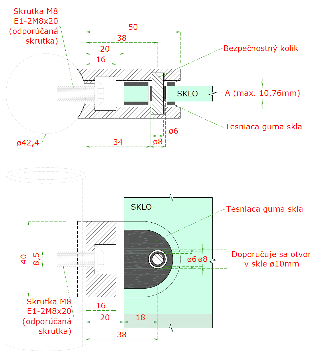 E-Z410 - svorka skla vhodná pro výplň tl. 6 - 8,76 mm, rozměr 50 x 40 x 26 mm (šířka x výška x hloubka), uchycení na sloupek ø 42,4 mm, materiál ZAMAK - slitina AL, Zn. Balení neobsahuje gumové těsnění - viz související produkty.