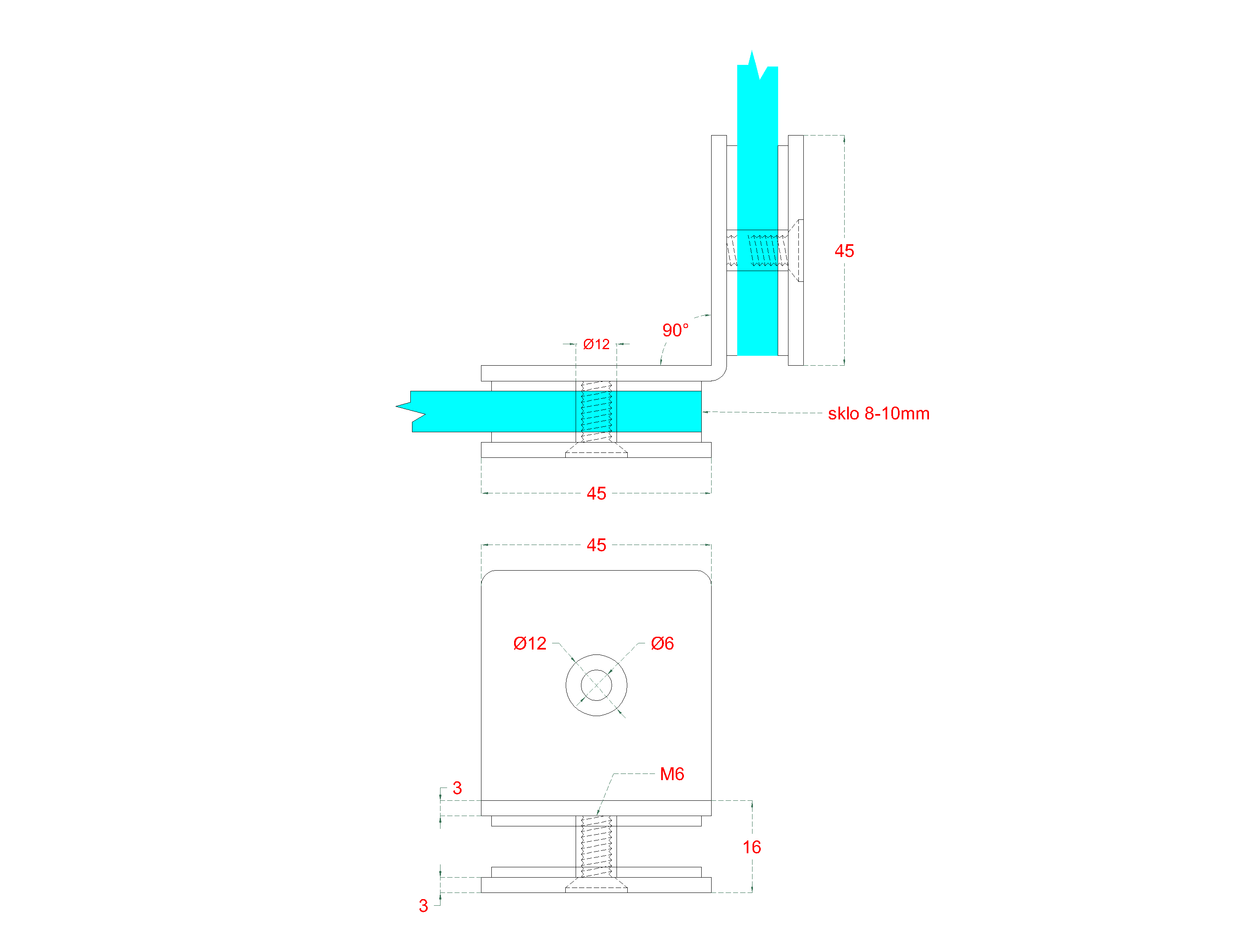 Svorka skla na skleněný dveřní systém mezi sklo a sklo 90°, rozměr 45 x 45 mm, pro tloušťku skla 8 -...Ukaž celý popis >