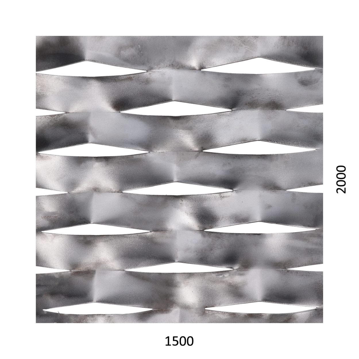 Tahokov, kosočtvercová oka 114 x 53 mm, můstek 24 mm, Fe bez povrchové úpravy. Rozměr: šířka 1500 mm, výška 2000 mm, tloušťka 1,5 mm.