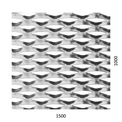 Tahokov, materiál hliník, kosočtvercové oko 110 x 52 mm, můstek 24 mm, tloušťka 2 mm. Orientace oka: rozměr oka 110 mm je rovnoběžný se šířkou tabule. Perforace (volná plocha) - 8%.