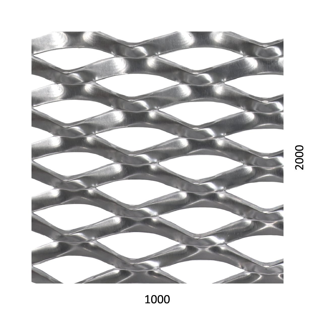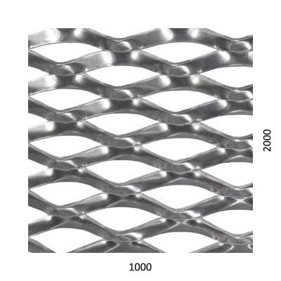 Tahokov, materiál hliník, kosočtvercové oko 62,5 x 25 mm, můstek 9,1 mm, neválcovaný. Rozměr: šířka 1000 mm, výška 2000 mm, tloušťka 2 mm. Orientace oka: rozměr oka 62,5 mm je rovnoběžný s rozměrem tabule 1000 mm.