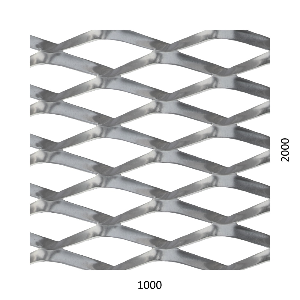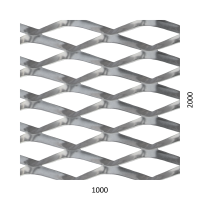 Tahokov, materiál hliník, kosočtvercové oko 85 x 35 mm, můstek 11 mm. Rozměr: šířka 1000 mm, výška 2000 mm, tloušťka 1,5 mm. Orientace oka: rozměr oka 85,5 mm je rovnoběžný s rozměrem tabule 1000 mm.