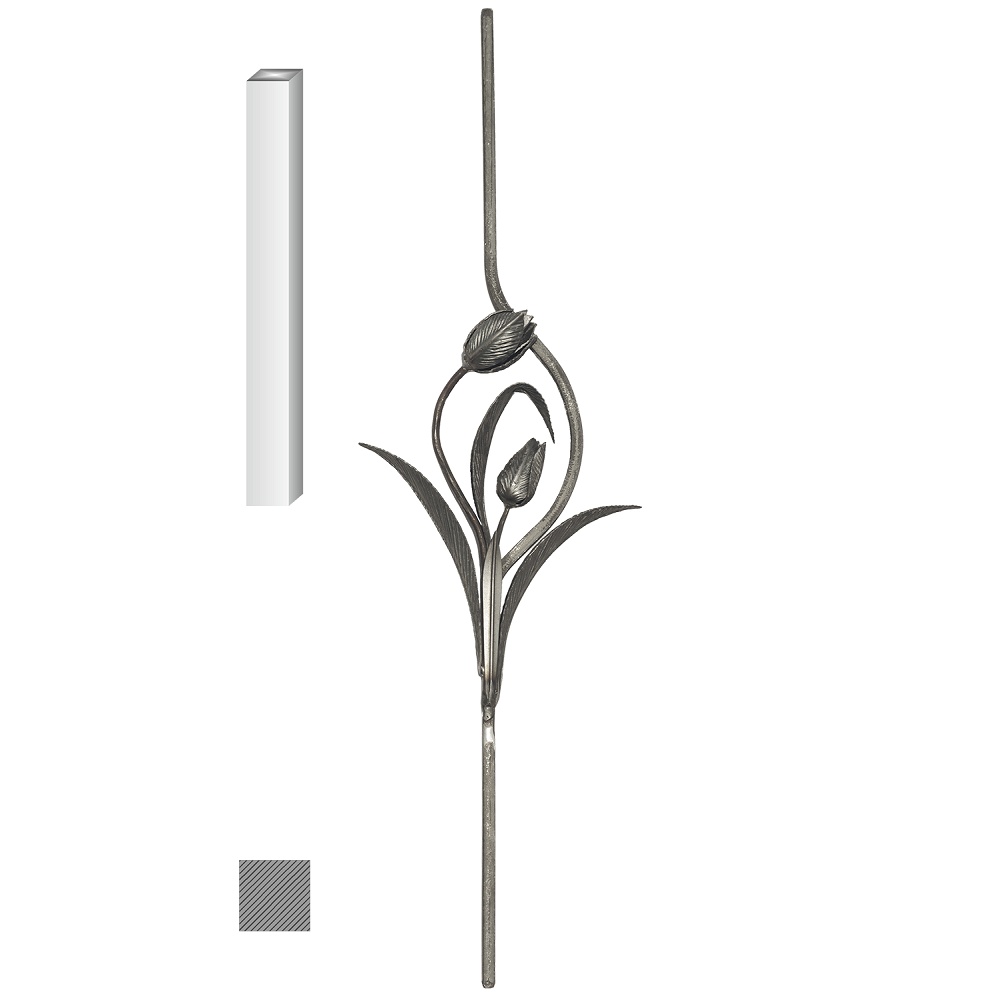 T041 - kovaná výplň zábradlí s ornamentem, tyč 950 x 250 mm, 12 x 12 mm, hladká ocel bez povrchové úpravy.