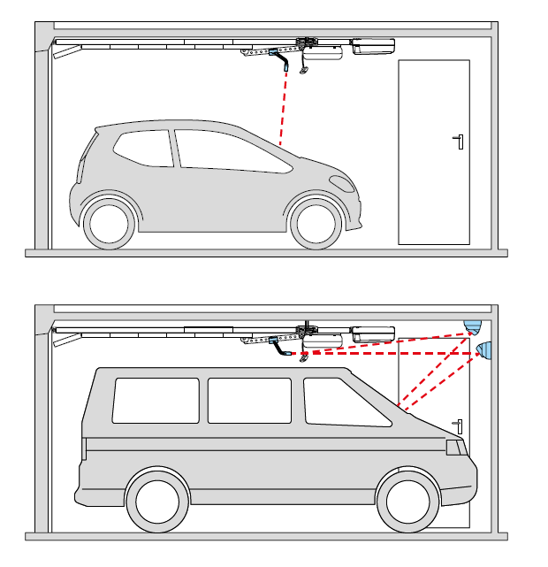 Laser - optická pomoc při parkování vozidla v garáži. Laser je aktivní během procesu otevírání a nastavené doby osvětlení.