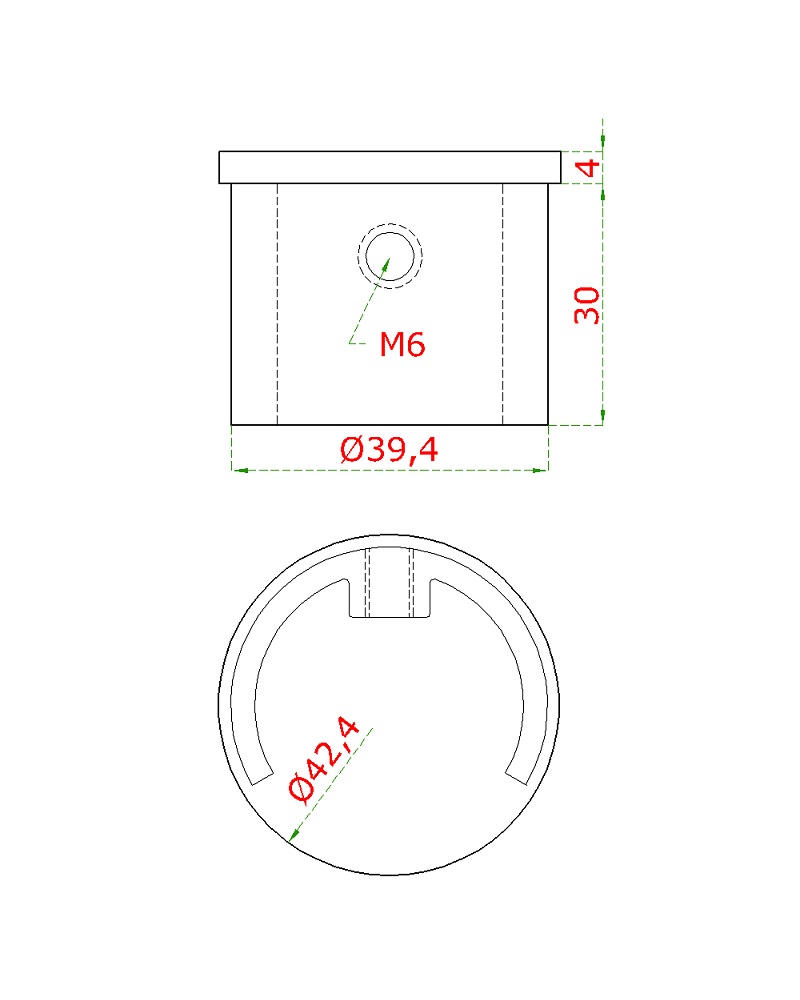Ukončení - zátka ø 42, 4 x 1,5 mm na kruhové madlo HM40, lepený spoj, materiál broušená nerez K320 / AISI304.
