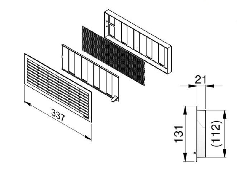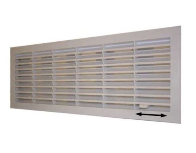 Větrací mřížka do vrat - dveřní větrací mřížka 337 x 131 mm uzavíretelná s nastavitelnou mřížkou, PŘEDNÍ DÍL, pro tl. panelu min. 35 mm, barva bílá. Součástí mřížky je síťka proti hmyzu. Použití interier i exterier. Materiál plast ASA.