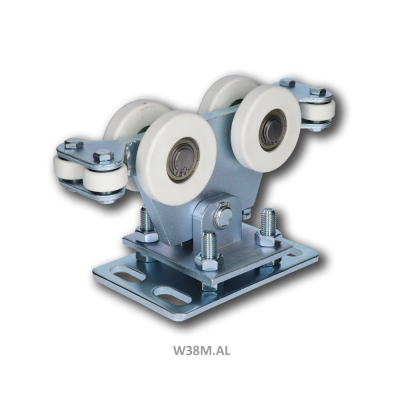 W38M.AL - vozík pro hliníkový C profil 95 x 100 mm, 8 ks polyamidových koleček, výškově nastavitelný, pozinkovaný. Doporučená maximální šířka průjezdu 6,5 m, hmotnost brány max. 150 kg.