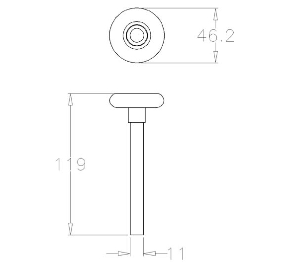 Kolečko pro sekční průmyslová vrata, materiál nylon a pozinkovaná ocel, ložisko nerezová ocel, vnější průměr 46,2 mm, hřídel průměr 11 mm, celková délka 119 mm, max. zatížení 35 kg.
