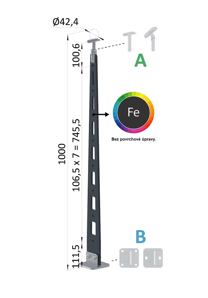 vypalovaný sloupek zábradlí, 8-děrový, železo / nerez