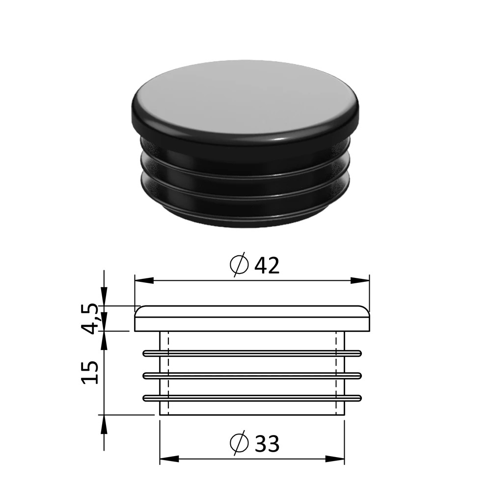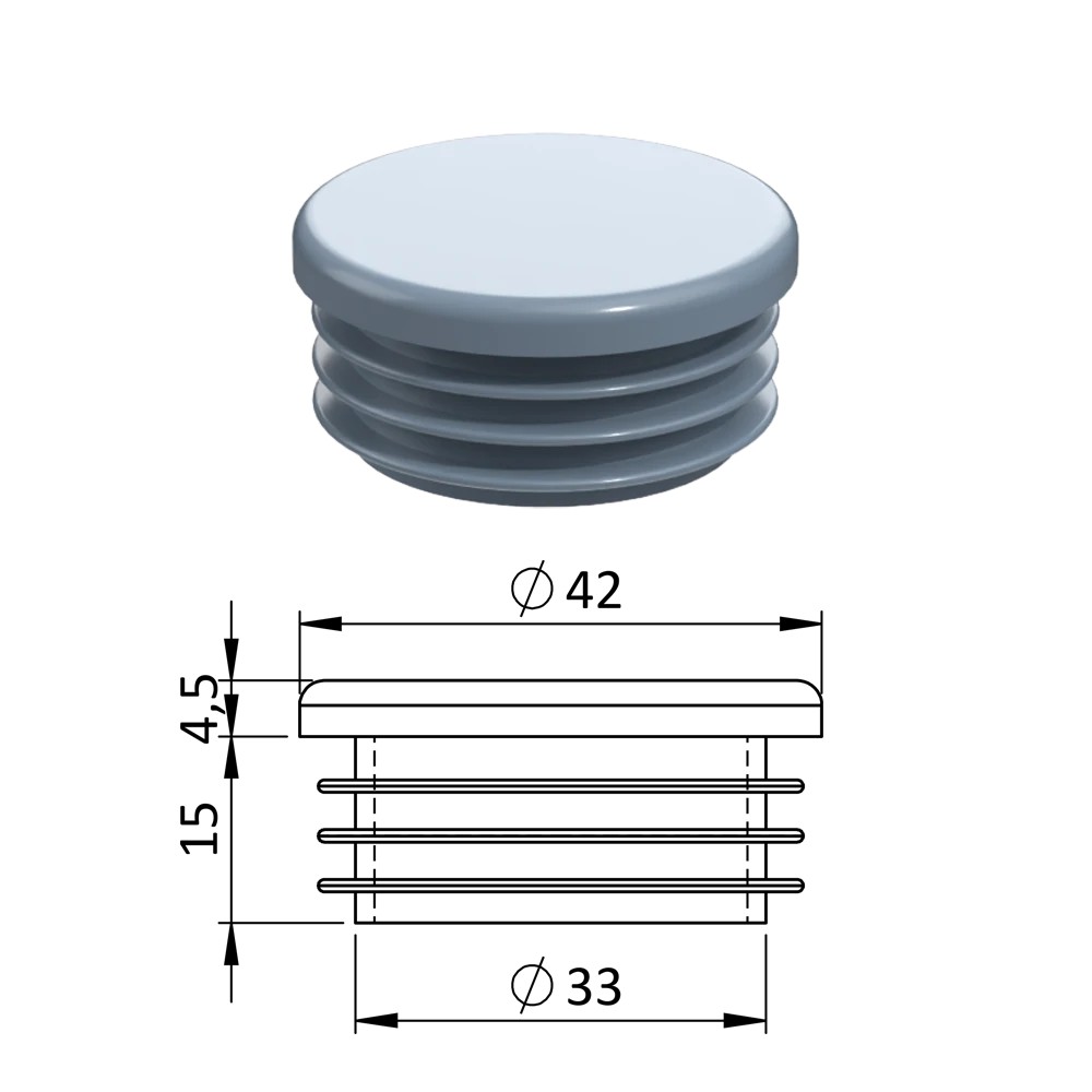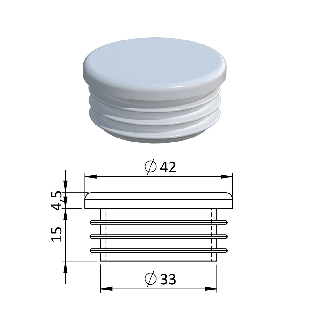 Krytka profilu plastová 1 1/4", vnější průměr 42,4 mm. Dodáváme v barvách: černá RAL9005, bílá RAL9010, šedá RAL 7040.