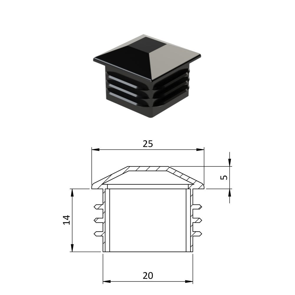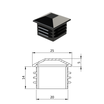 Krytka profilu plastová 25 x 25 mm se stříškou. Dodáváme v barvě: černá RAL9005.