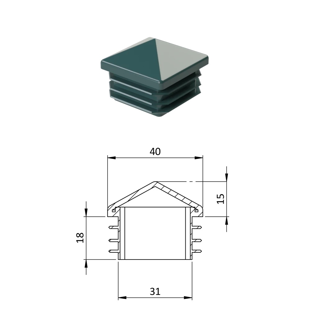 Krytka profilu plastová 40 x 40 mm se stříškou. Dodáváme v barvách: černá RAL9005, šedá RAL 7040, zelená RAL 6005.
