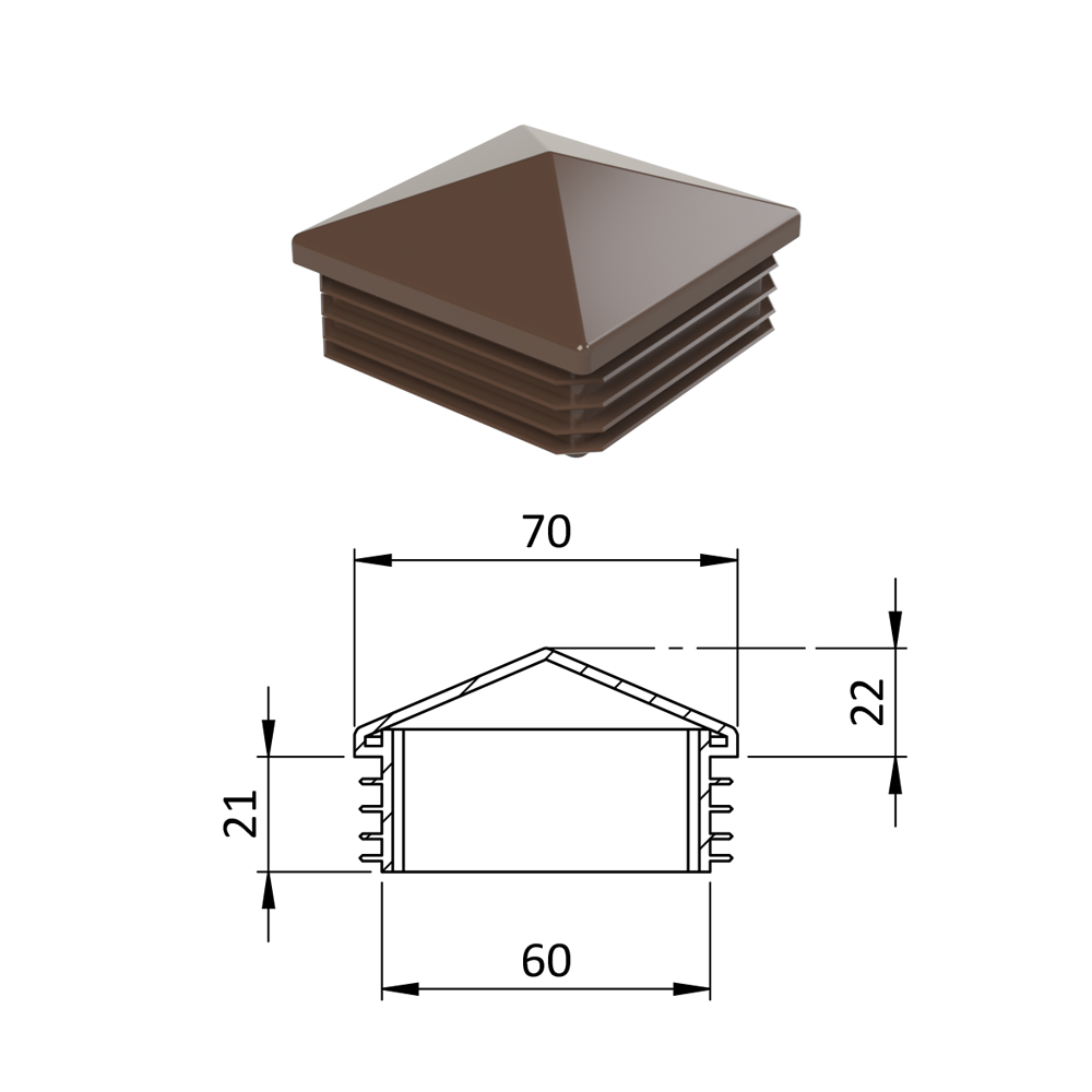 Krytka profilu plastová 70 x 70 mm se stříškou. Dodáváme v barvách: černá RAL9005, šedá RAL 7040, hnědá RAL 8028.