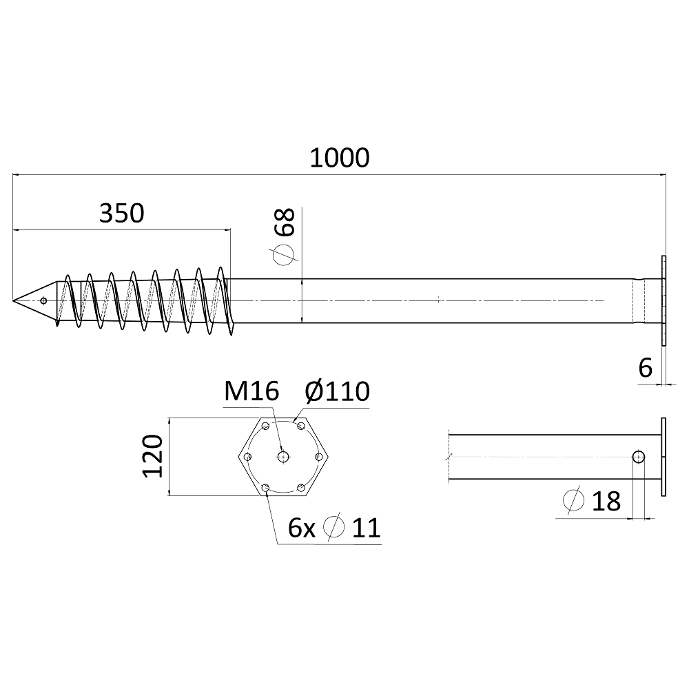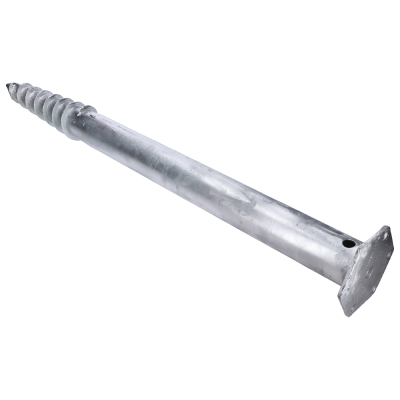 Zemní vrut s patkou s přírubou, rozměr 120 x 1000 mm. Pro plotové sloupky, slunečníky, sušáky prádla, zahradní stavby. Za zlomek času potřebného pro vykopání a vybetonování základů lze založit stavbu na zemních vrutech. Základy je možné okamžitě zatížit, odpadá technologická přestávka při betonáži. Bez kopání, betonování a odvozu vykopané hlíny. Zemní vrut při zašroubování do země díky kónusovému tělu zhutní a stlačí zeminu ve svém okolí a tak vznikne díky ploše pravidelného závitu na těle vrutu velmi pevný základ.