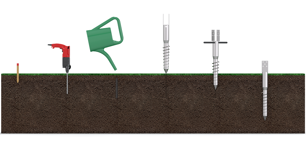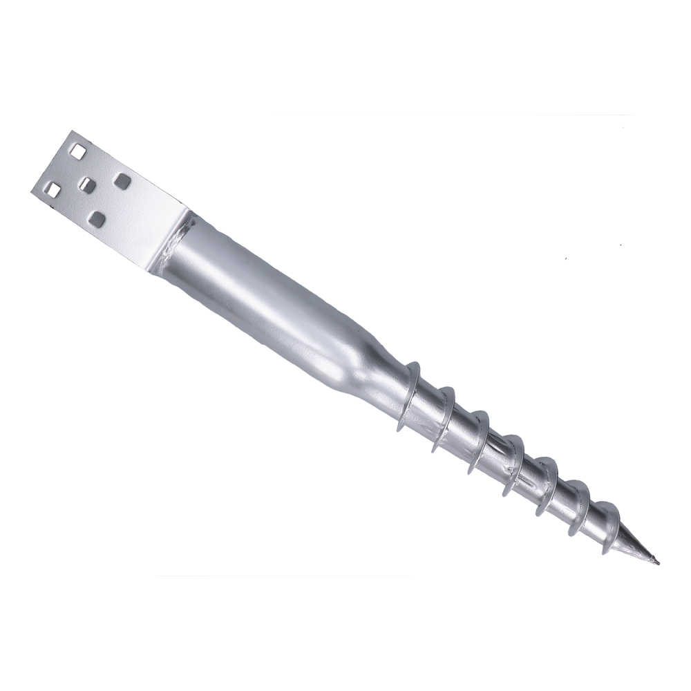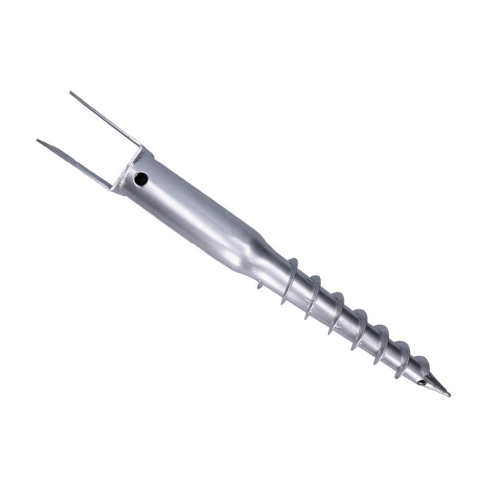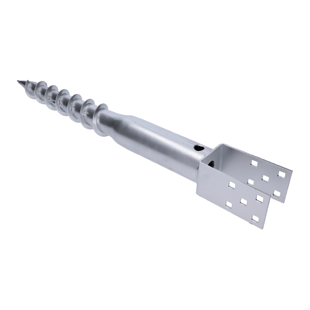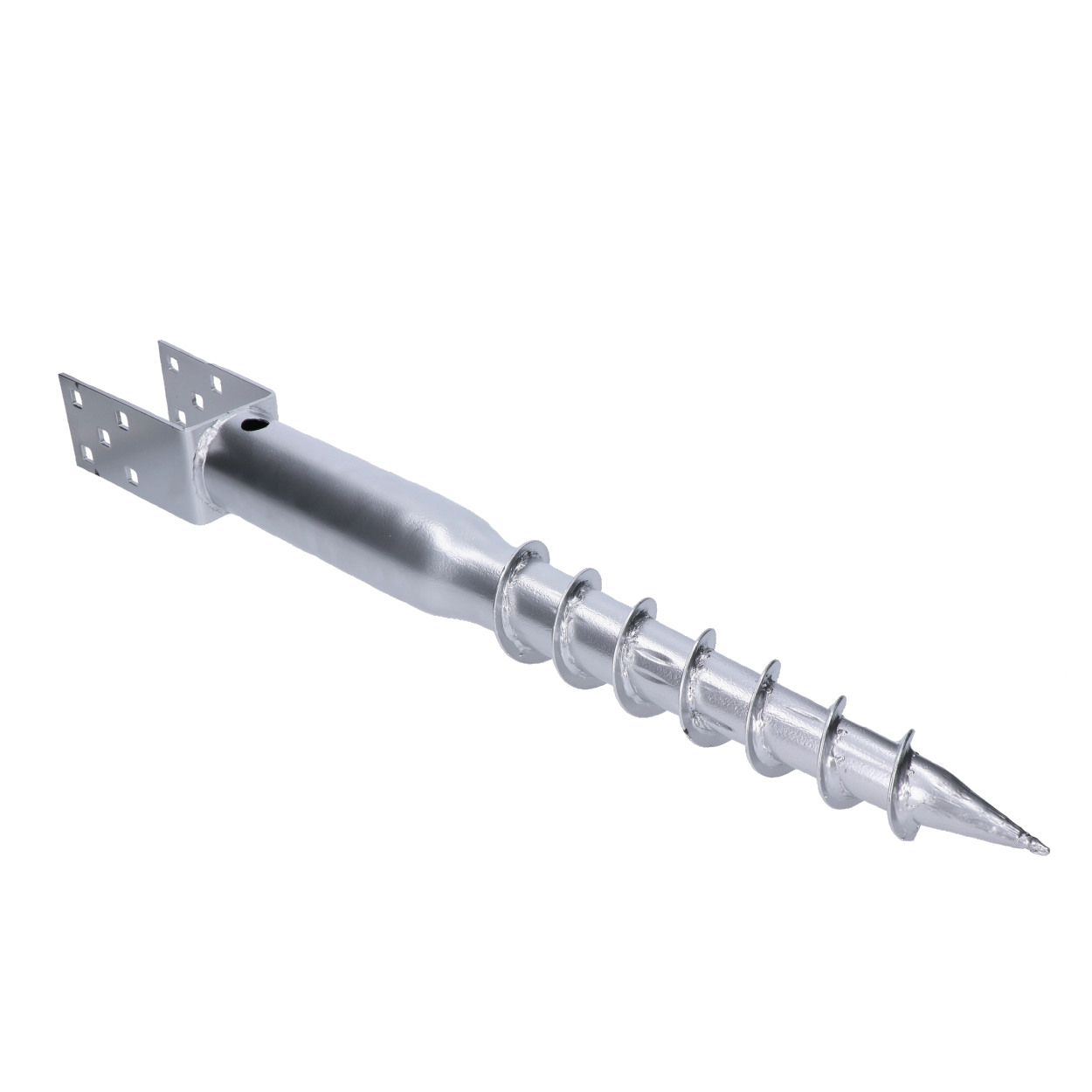 Zemní vrut s U patkou, délka 700 - 900 mm, tloušťka plechu 1,8 - 2,0 mm. Pro plotové sloupky, slunečníky, sušáky prádla, zahradní stavby. Za zlomek času potřebného pro vykopání a vybetonování základů lze založit stavbu na zemních vrutech. Základy je možné okamžitě zatížit, odpadá technologická přestávka při betonáži. Bez kopání, betonování a odvozu vykopané hlíny. Zemní vrut při zašroubování do země díky kónusovému tělu zhutní a stlačí zeminu ve svém okolí a tak vznikne díky ploše pravidelného závitu na těle vrutu velmi pevný základ.