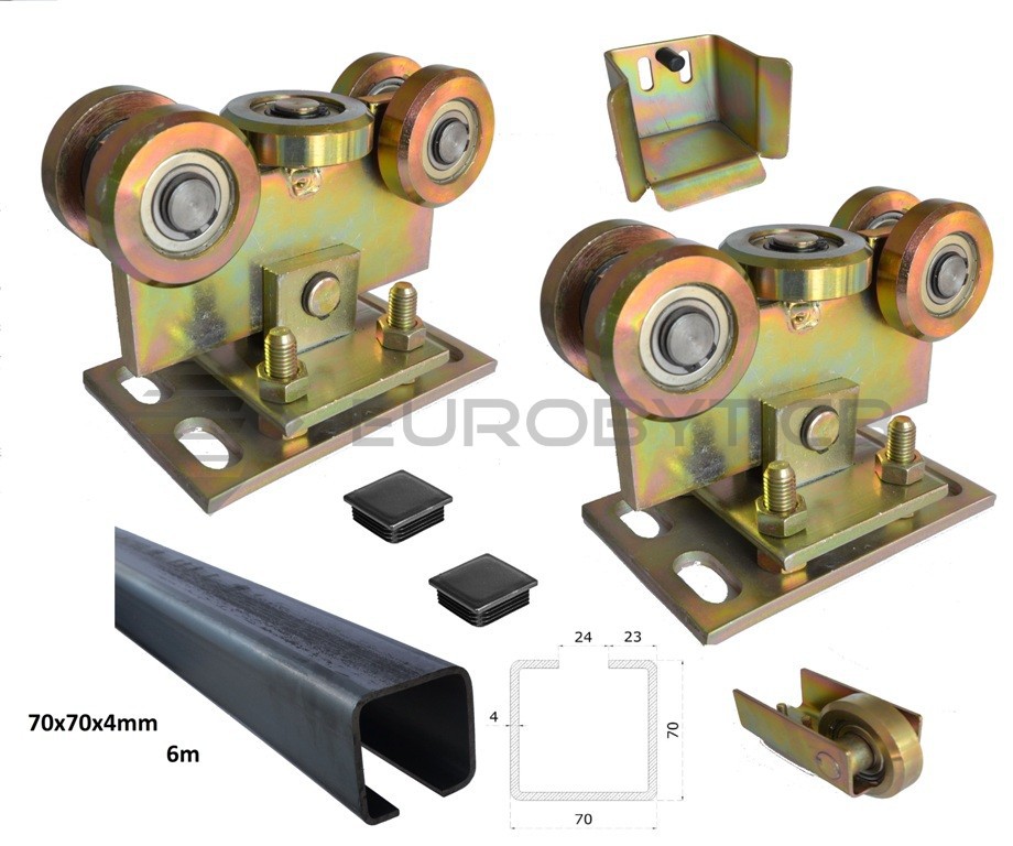 Za cenu 3.508,- Kč dostanete kompletní sadu komponentů pro výrobu nesené brány - 2 stavitelné kyvné vozíky, 6 bm vodícího C profilu 70 x 70 mm, kapsu, nájezdové kolo a 2 ks ucpávek profilu.
